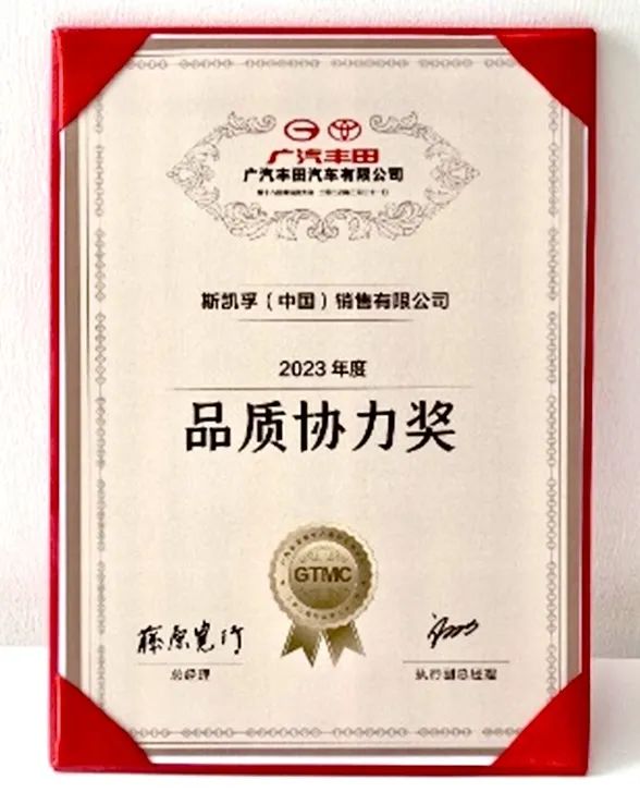 備受認可 | 斯凱孚連續三年榮獲廣汽豐田“品質協力獎”