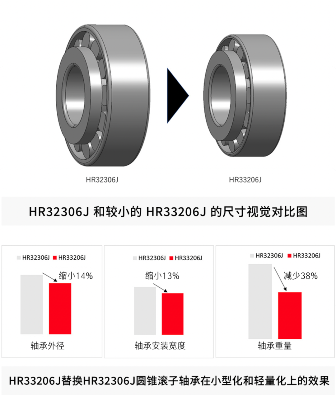 例:圓錐軸承HR32306J可以替換為更小的HR33206J。通過軸承替換,實現了小型化(軸承外徑縮小約14%,軸承安裝寬度縮小約13%)及輕量化(軸承重量減少約38%)。